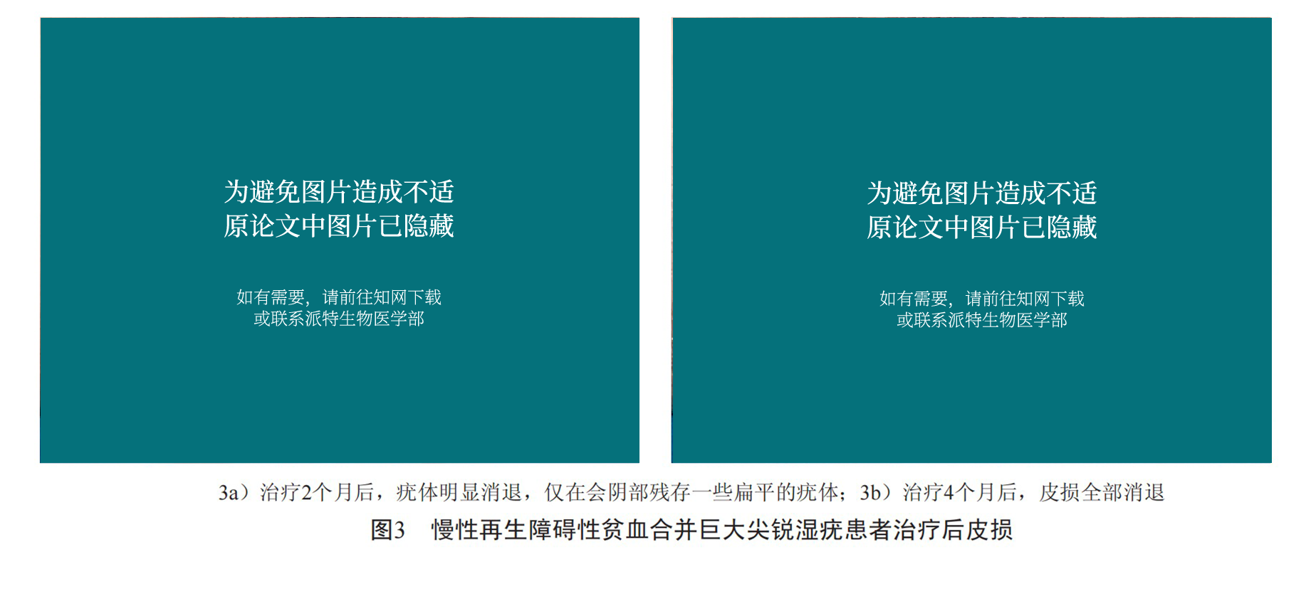本例是一慢性再生障礙性貧血患者,由于長期使用免疫抑制劑,成為 HPV 易感人群,發(fā)生了外陰肛周部 GCA。由于患者血小板偏低,疣體又過于巨大,為確?;颊叩闹委煱踩?,采用中藥派特靈治療,經(jīng)過 2 個(gè)月的治療患者疣體明顯消退,4 個(gè)月后皮損全部消退。治療效果滿意。