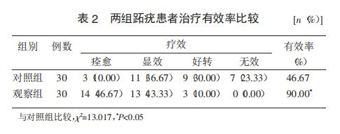 觀察組患者的有效率為90.00%,明顯高于對(duì)照組的46.67%(P<0.05)(表2)。
