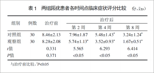 ③疼痛程度,劇烈疼痛 3 分,一般疼痛 2 分,微痛1分,無痛0分;記錄患者在治療前、治療第2周、第 4 周及第 8 周的癥狀評(píng)分,分?jǐn)?shù)越高表示癥狀越嚴(yán)重。