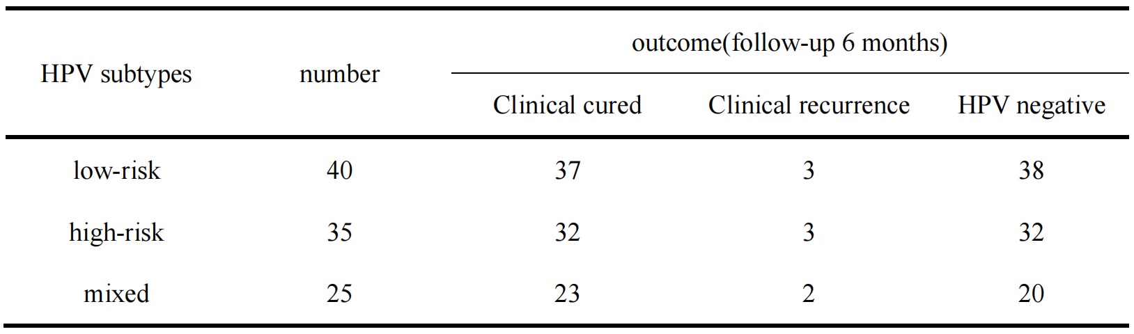 One hundred condyloma acuminatum patients completed five weeks of treatment. The therapeutic evaluation was based on the clinical outcomes both before and after 6 months of follow-up, as well as whether the HPV virus was determined to be negative or not (Figure 1). Ninety-two of the patients were clinically cured and exhibited no recurrence, and eight exhibited improvements but recurrences after follow-ups for 2 to 3 months.The incidences of HPV virus were reexamined after 6 months of follow-ups. Ninety of the clinically cured patients exhibited negative indications, two of the patients were determined to be positive for HPV and eight recurrence patients were still demonstrated to be positive for HPV. Six months after treatment, the numbers of negative cases of low-risk, high-risk and mixed types of HPV were 38,32 and 20,respectively (Table 1). There was no statistical difference among different HPV subtypes in clinical outcomes and HPV clearance (P>0.05).